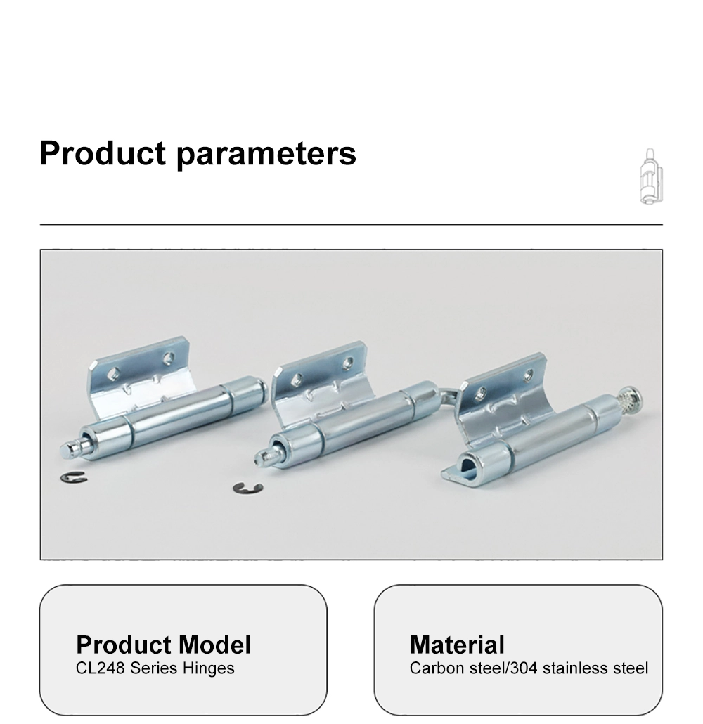 La charnière pivotante du tableau de distribution prend en charge la fixation par vis et l'installation par soudage. Le montage par vis convient aux armoires en tôle standard, tandis que le soudage est utilisé sur les cadres nécessitant un positionnement permanent des charnières. La charnière pivotante pour tableau de distribution CL248 s'adapte à différents processus de fabrication de boîtiers et maintient l'installation stable sur les armoires électriques et les boîtiers de base.