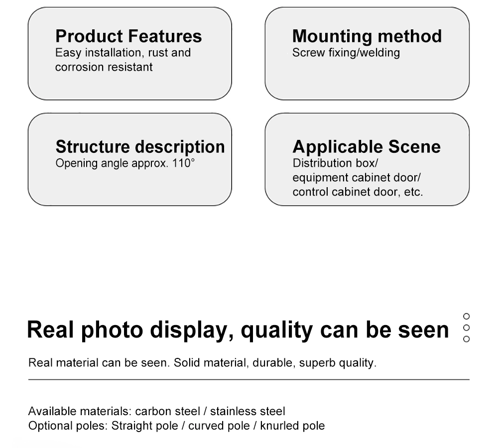 Yitai Lock a en stock une charnière pivotante pour tableau de distribution pour les projets d'armoires industrielles. Avec un angle d'ouverture allant jusqu'à 110°, la charnière pivotante pour tableau de distribution CL248 offre suffisamment d'espace pour le câblage, l'inspection et la maintenance. Il peut être fixé par vis ou par soudage en fonction de la structure de l'armoire. Avec une tige droite, une tige courbée ou une tige moletée en option, la charnière pivotante pour tableau de distribution s'adapte à différentes configurations de cadres de porte et méthodes d'assemblage.