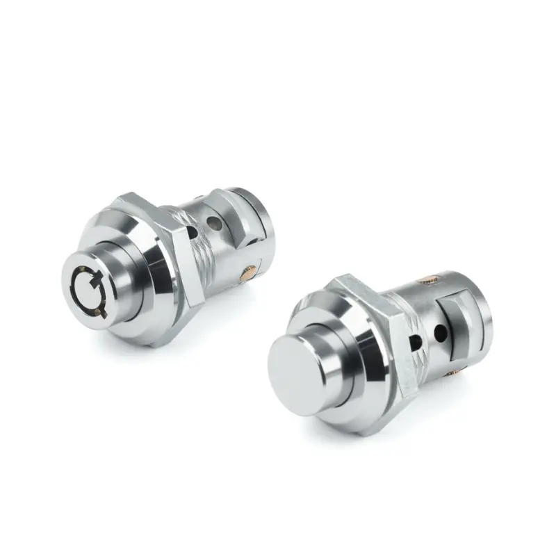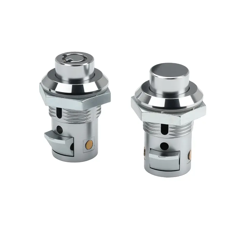 Le modèle à bouton-poussoir se déverrouille automatiquement lorsque le bouton est enfoncé et se verrouille lorsque la porte est fermée, offrant ainsi une protection de sécurité de base. Le modèle de serrure à goupille utilise un mécanisme à goupille qui permet uniquement la rotation avec une clé correspondante, offrant une fonctionnalité antivol. Les deux modèles utilisent une construction en alliage de zinc pour offrir un certain niveau de résistance et comportent des joints étanches supplémentaires pour plus de praticité. La serrure à cylindre en alliage de zinc des distributeurs automatiques a une finition chromée brillante pour une résistance à la corrosion. L'épaisseur maximale des panneaux de porte installés est de 10 mm. (Pour les matériaux en acier inoxydable, veuillez nous contacter. Nous fabriquons actuellement les moules.)