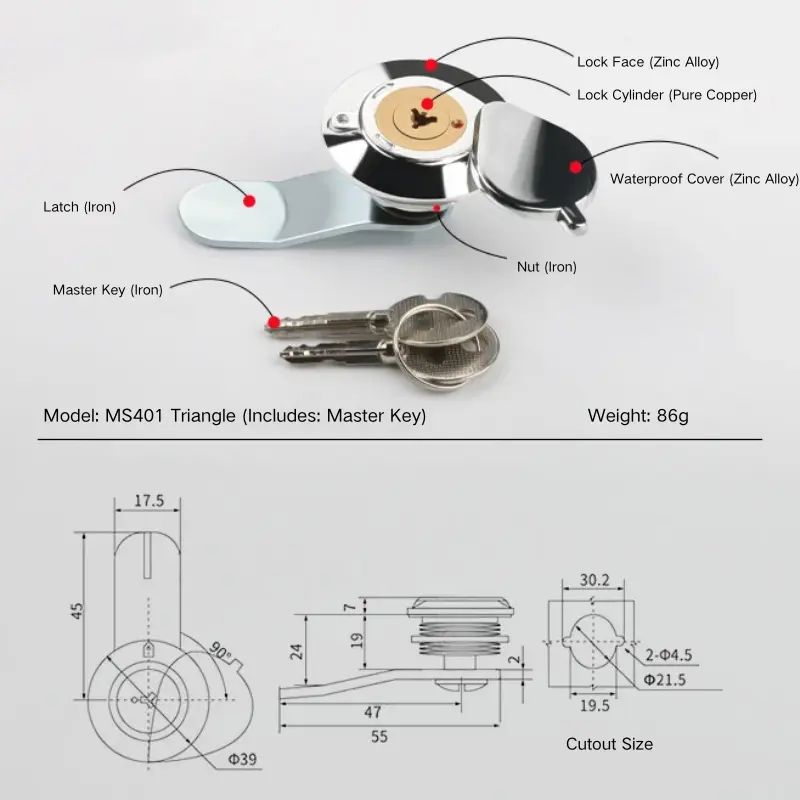 Le couvercle étanche et la face de verrouillage de la serrure extérieure étanche sont fabriqués en alliage de zinc, offrant une bonne résistance structurelle. Le cylindre de serrure est en cuivre pur pour le rendre plus durable. Le loquet, les écrous et la clé principale sont en fer.